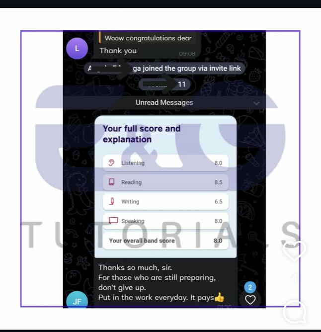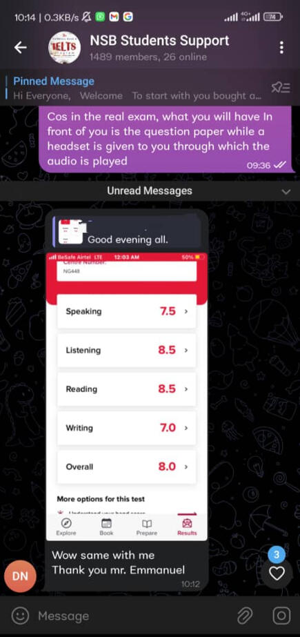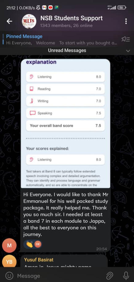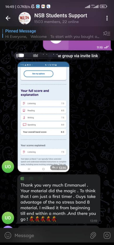 With access to this telegram live support group, you’ll never have to walk the IELTS journey alone.Inside, you’ll meet a community of like minded people like you,Who are ready to answer your questions, share shortcuts, keep you updated......and moving when the journey feels tough.It’s like being in a classroom with supportive friends…People who understand exactly what you’re going through......and are there to cheer you on every step of the way.They'll give you a kind of support that turns what could have been a lonely struggle into a shared victory.