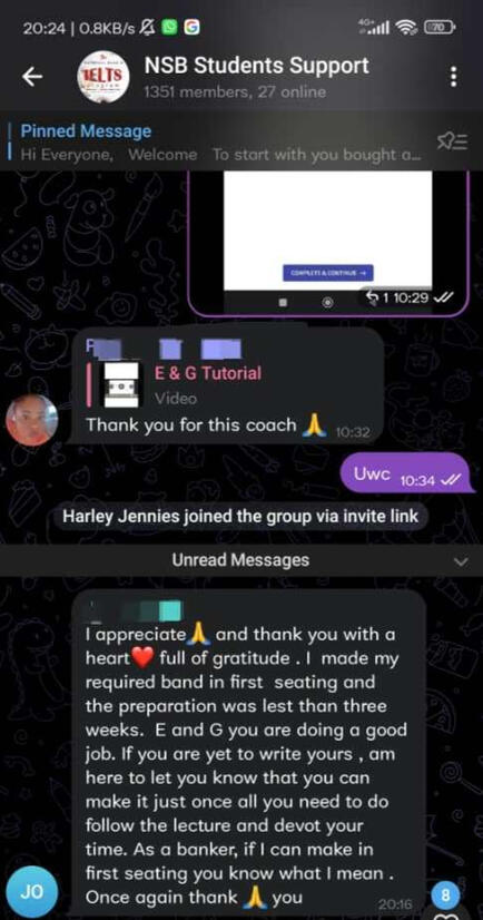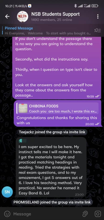 With access to this telegram live support group, you’ll never have to walk the IELTS journey alone.Inside, you’ll meet a community of like minded people like you,Who are ready to answer your questions, share shortcuts, keep you updated......and moving when the journey feels tough.It’s like being in a classroom with supportive friends…People who understand exactly what you’re going through......and are there to cheer you on every step of the way.They'll give you a kind of support that turns what could have been a lonely struggle into a shared victory.